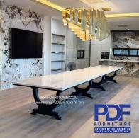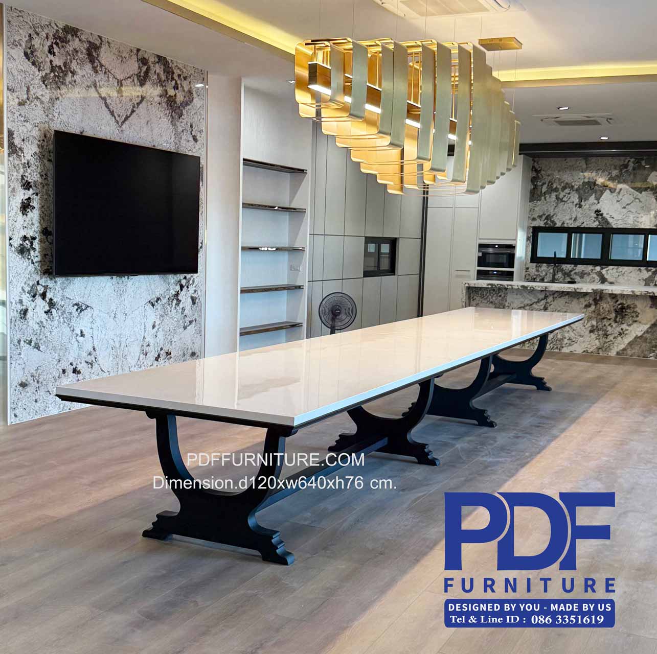 โต๊ะทานข้าว20ที่นั่ง ขนาดตามภาพ d120xp640xส76ซม. ขาโต๊ะ ทำจากไม้สักพ่นสีดำด้าน ทอปโต๊ะ ทำจากหินสังเคราะห์ ลายWhite Onyx นำเข้าจากอิตาลี สำหรับนั่ง20ท่าน ท่านอื่นสามารถสั่งทำได้ตามขนาด/พื้นที่สามารถเลือกวัสดุได้ รับบริการส่งทั่วไทย สนใจติดต่อ สนง.ขาย/โชว์รูม บ.พีดีเอฟ กรุ๊ป จำกัด เขตคลองสามวา กรุงเทพฯ 10510 โทร.02 376 8745 ,086 3351619 ,089 105 1619,Line ID. pdfgroup ,email.deanpdf@pdffurniture.com เวปไซด์ www.pdffurniture.com