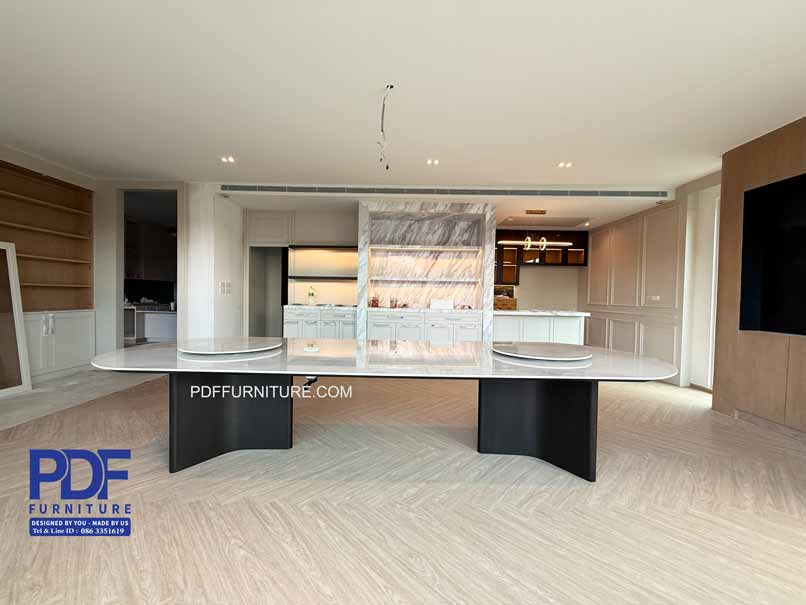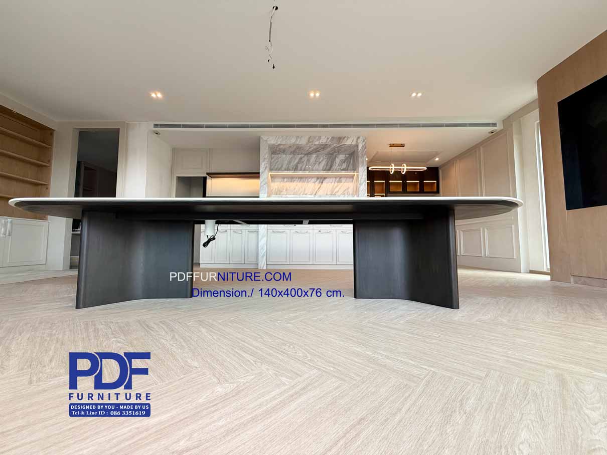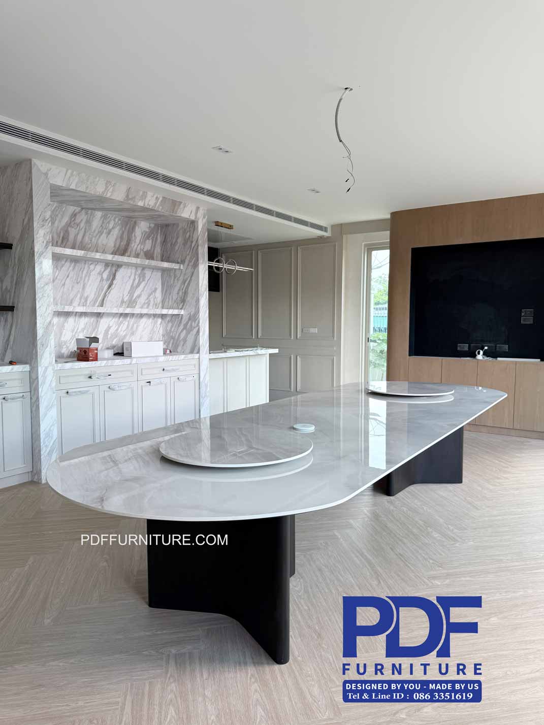 โต๊ะทานข้าว14ที่นั่ง ขนาดตามภาพ d140xp400xส76ซม. ขาโต๊ะ ทำจากไม้สักพ่นสีดำด้าน ทอปโต๊ะ ทำจากหินสังเคราะห์ ลายWhite Onyx นำเข้าจากอิตาลี สำหรับนั่ง 14ท่าน ท่านอื่นสามารถสั่งทำได้ตามขนาด/พื้นที่สามารถเลือกวัสดุได้ รับบริการส่งทั่วไทย สนใจติดต่อ สนง.ขาย/โชว์รูม บ.พีดีเอฟ กรุ๊ป จำกัด เขตคลองสามวา กรุงเทพฯ 10510 โทร.02 376 8745 ,086 3351619 ,089 105 1619,Line ID. pdfgroup ,email.deanpdf@pdffurniture.com เวปไซด์ www.pdffurniture.com