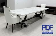 ขนาดโต๊ะ 120x300x76 ซม. ขาทำจากไม้สักย้อมสีน้ำตาลเข้ม ทอป ทำจากหินสังเคราะห์(อิตาลี่)รุ่นStatuario Oro วางเข้าชุดกับเก้าอี้ตอกหมุดลายดอกและ ดึงดุม10ตัว