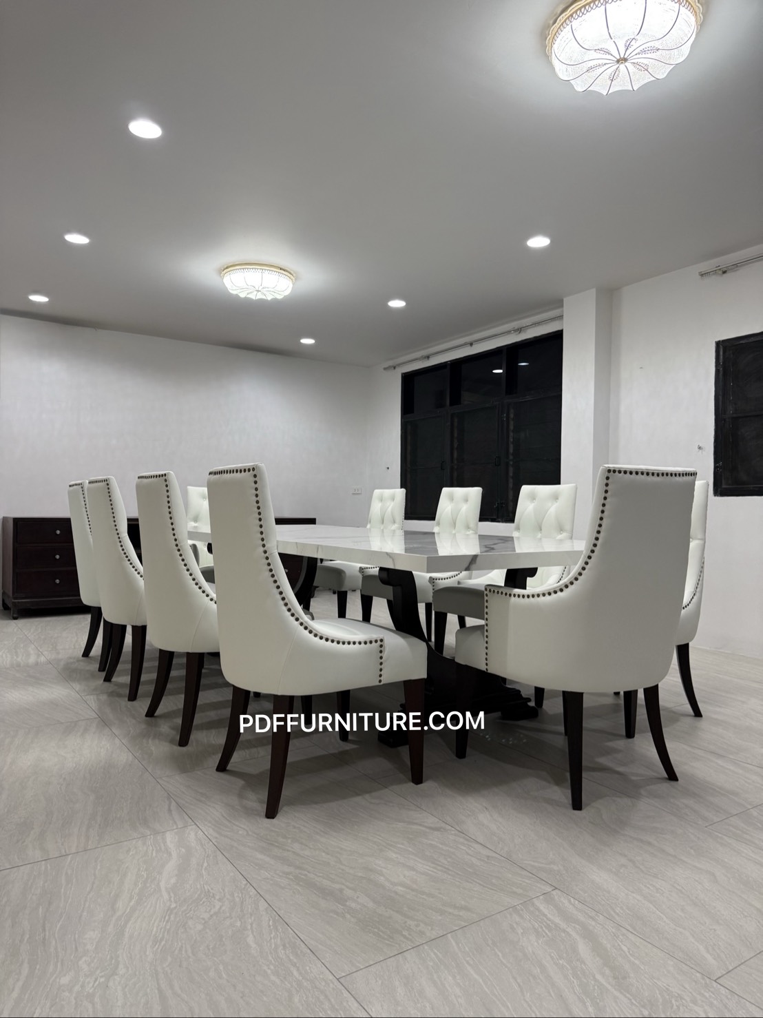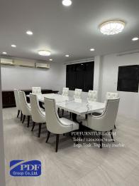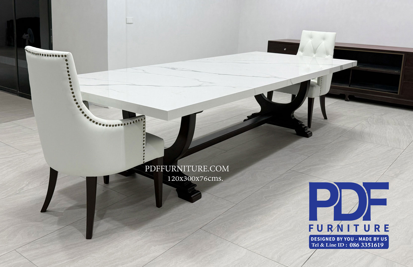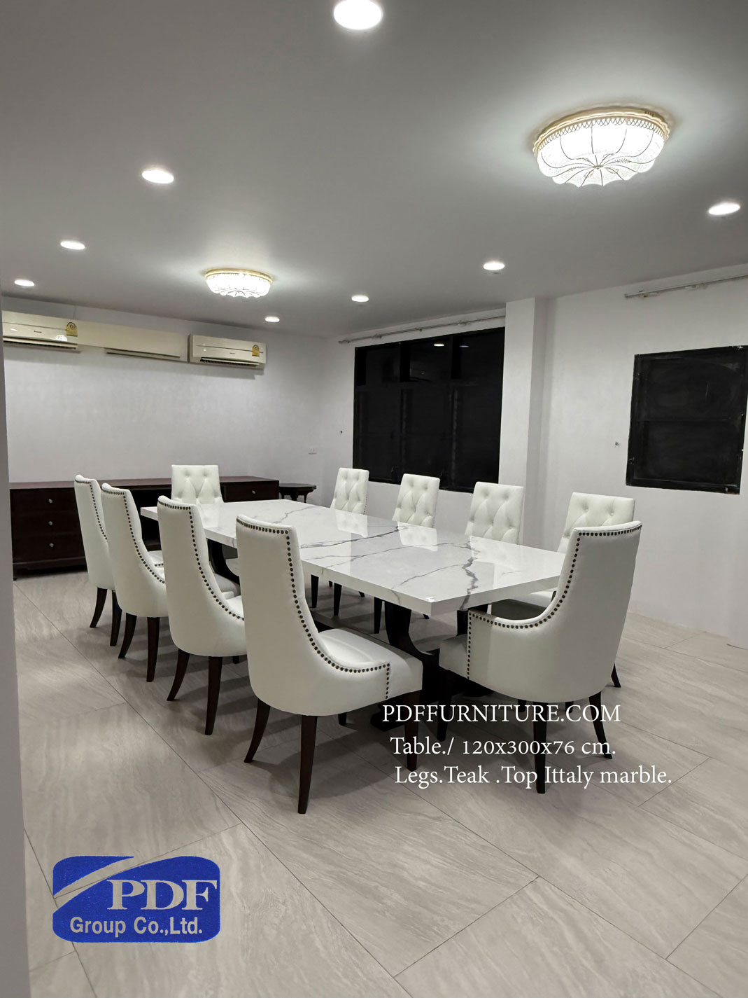โต๊ะทานช้าว10ที่ ขนาดโต๊ะ 120x300x76 ซม. ขาทำจากไม้สักย้อมสีน้ำตาลเข้ม ทอป ทำจากหินสังเคราะห์(อิตาลี่)รุ่นStatuario Oro วางเข้าชุดกับเก้าอี้ตอกหมุดลายดอกและ ดึงดุม10ตัว **ลูกค้าสั่งทำได้ตามขนาดและเลือกวัสดุได้** ติดต่อ บจก.พีดีเอฟ กรุ๊ป โชว์รูม/สำนักงานฝ่ายขายโทร. 02 376 8745 ,086 335 1619 ,065 389 9629 ,Line ID.pdfgroup ,email.deanpdf@pdffurniture.com